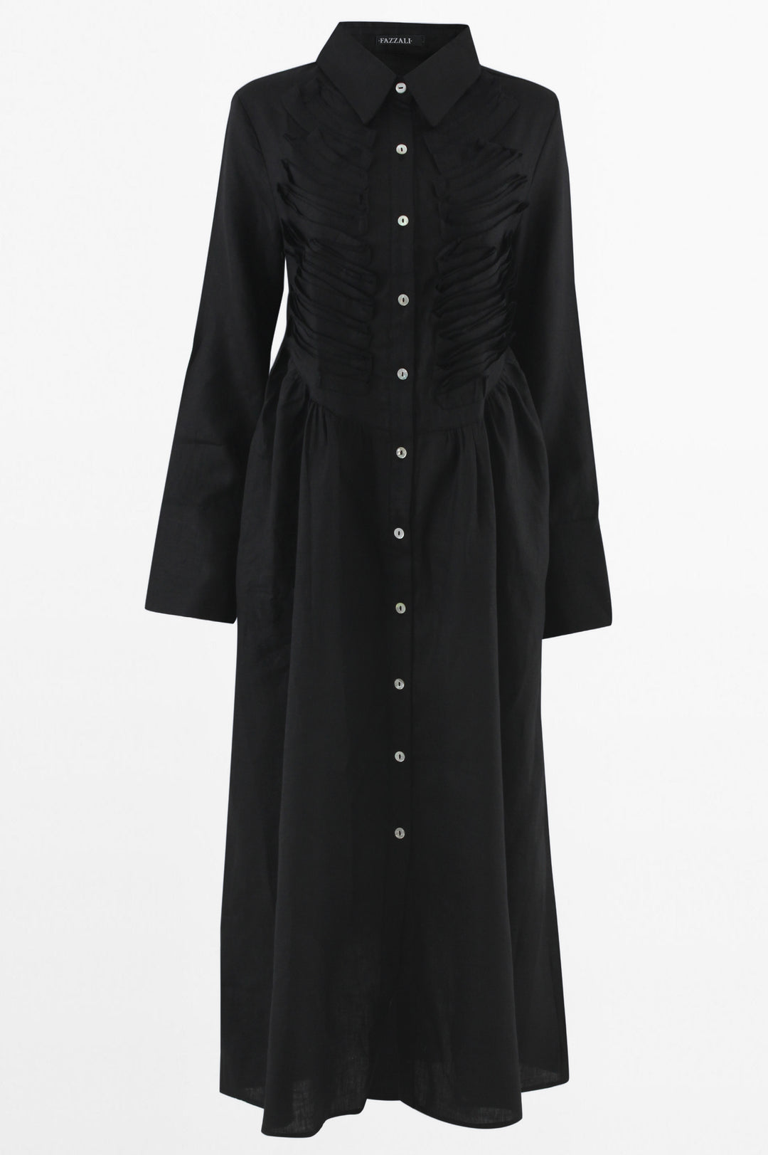 The FAZZALI Sculpted Pleat Midi Shirt Dress is a refined expression of modern femininity, crafted from breathable linen with sculptural pleated detailing along the front panel. Featuring a structured collar, full button-down front, and relaxed midi fit, this linen shirt dress for women is perfect for elevated everyday wear and effortless styling.
